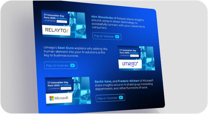 Alex Shevelenko of Relayto shares insights around using AI-driven technology to successfully connect with your customers & consumers. Play on Youtube Umego’s Sean Dunn explains why adding the human element into your AI solutions is the key to business success. Play on Youtube Bachir Kane, and Frederic Wickert of Microsoft share insights around AI shaking up marketing departments, and other functions of work. Play on Youtube